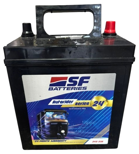 SF SONIC 24S-32R (32Ah) provides reliable cranking (~280CCA) with zero-maintenance MF design, right-positive terminal optimized for Bajaj RE, TVS King autorickshaws. Dimensions 197x129x227mm (~9kg dry), high vibration resistance handles potholes/heavy loads; perfect for high-mileage commercial operations in Indian cities.